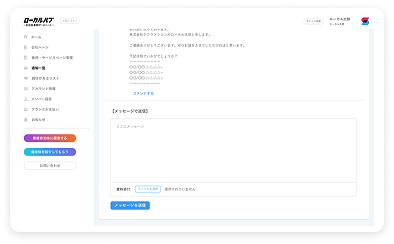 企業とのメッセージのやりとりはローカルハブのシステム内ですべて完結。 1つのやりとりにメッセージ履歴が残るため、外部ツールの横断は不要です。 このチャット機能により、企業とのコミュニケーションを円滑に進めることができます。